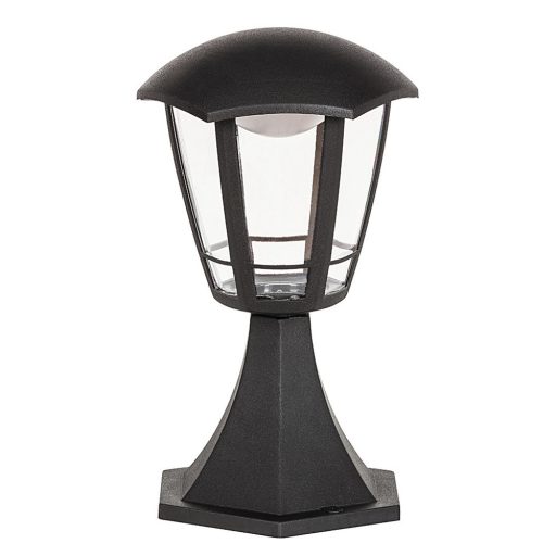 Mediterrán stílusú kültéri állólámpa beépített energiatakarékos LED fényforrással. 30 cm magas, 16,5 cm széles, matt fekete színű műanyag lámpatest műanyag lámpabúrával, IP44-es, azaz por és fröccsenő víz elleni védelemmel. A beépített LED fényforrás A energiaosztály besorolású és 8W teljesítmény mellett 500 lumenes fényerőt, valamint 3000 Kelvines, melegfehér színű fényt biztosít. A lámpatestbe beépített fényforrás nem cserélhető.