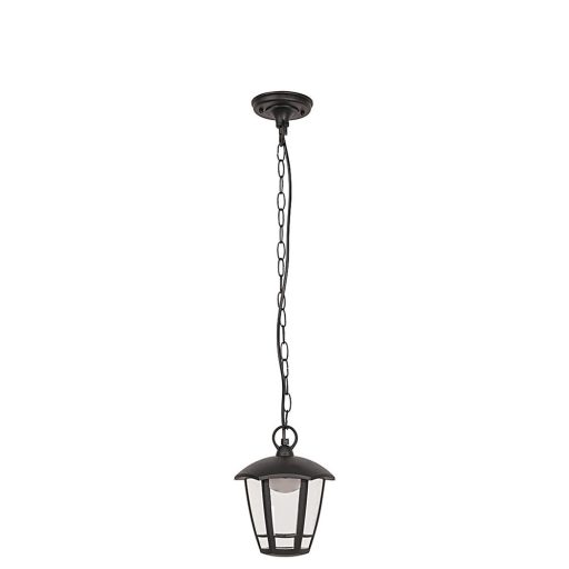 Mediterrán stílusú kültéri függeszték beépített energiatakarékos LED fényforrással. 80 cm lelógású, 16,5 cm széles, matt fekete színű műanyag lámpatest műanyag lámpabúrával, IP44-es, azaz por és fröccsenő víz elleni védelemmel. A beépített LED fényforrás A energiaosztály besorolású és 8W teljesítmény mellett 500 lumenes fényerőt, valamint 3000 Kelvines, melegfehér színű fényt biztosít. A lámpatestbe beépített fényforrás nem cserélhető.