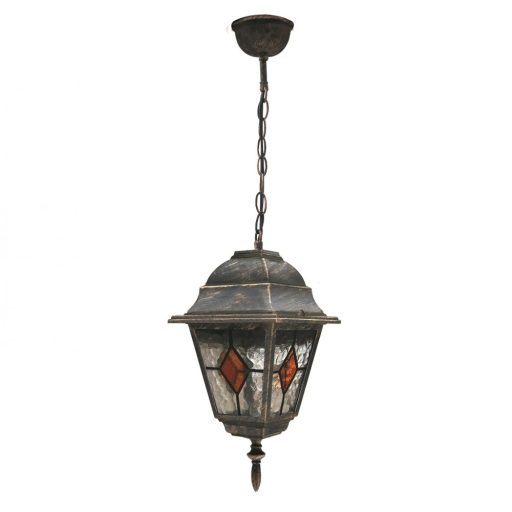Klasszikus stílusú, kültéri függeszték, antik arany színű fém vázzal, átlátszó és sárga színű Tiffany üveg búrával, IP43-as védelemmel.