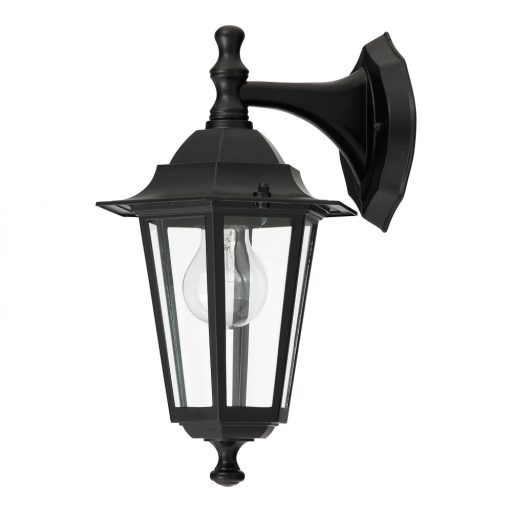 Klasszikus stílusú, kültéri fali lámpa, fekete színű fém vázzal, átlátszó üveg búrával, IP43-as védelemmel.