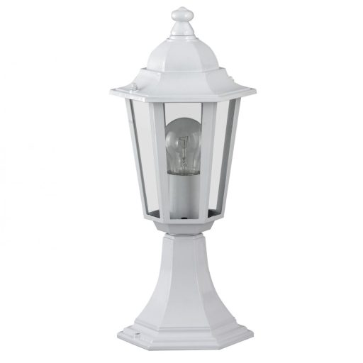Klasszikus stílusú, kültéri álló lámpa, fehér színű fém vázzal, átlátszó üveg búrával, IP43-as védelemmel.