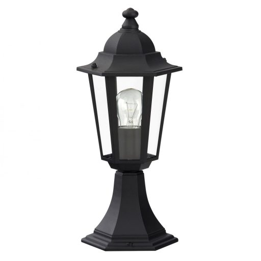 Klasszikus stílusú, kültéri álló lámpa, fekete színű fém vázzal, átlátszó üveg búrával, IP43-as védelemmel.