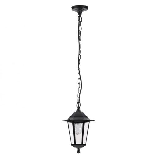Klasszikus stílusú, kültéri függeszték, fekete színű fém vázzal, átlátszó üveg búrával, IP43-as védelemmel.