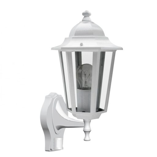 Klasszikus stílusú, kültéri mozgás-érzékelős fali lámpa, fehér színű fém vázzal, átlátszó üveg búrával, IP43-as védelemmel.