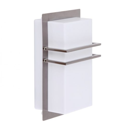 Modern stílusú, kültéri fali lámpa, rozsdamentes acél vázzal, opálos műanyag búrával, IP44-es védelemmel.
