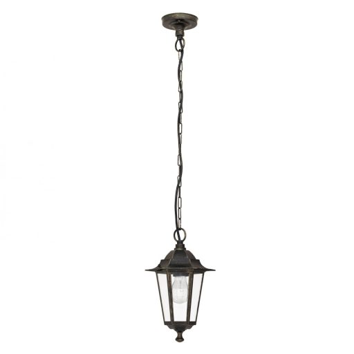 Klasszikus stílusú, kültéri függeszték, antik arany színű fém vázzal, átlátszó üveg búrával, IP43-as védelemmel.