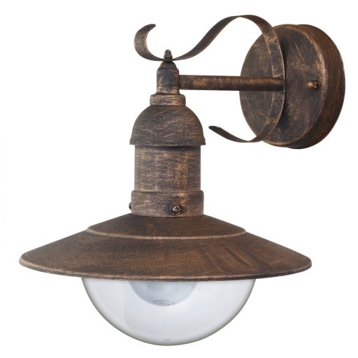 Klasszikus stílusú, kültéri falikar, antik arany színű fém vázzal, átlátszó műanyag búrával, IP44-es védelemmel.