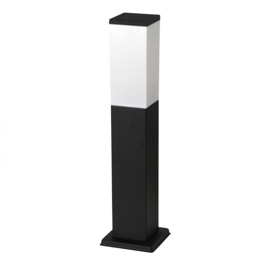 Modern stílusú, kültéri álló lámpa, matt fekete színű fém vázzal, fehér műanyag betétes búrával, IP44-es védelemmel.