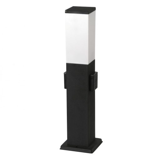 Modern stílusú, kültéri álló lámpa, matt fekete színű fém vázzal, fehér műanyag betétes búrával, IP44-es védelemmel, csatlakozó aljzattal.