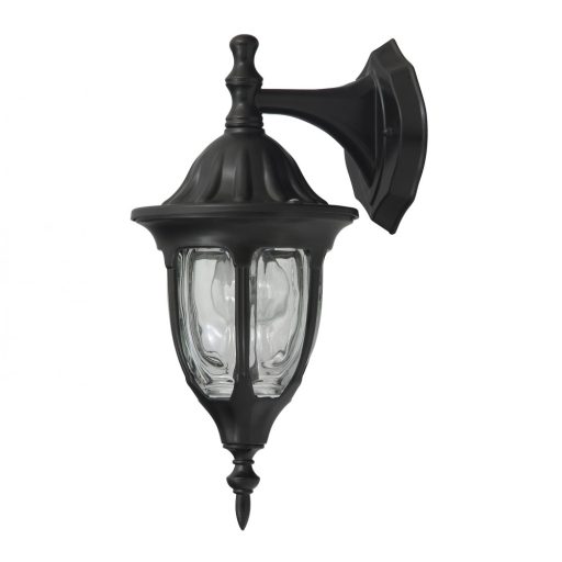 Klasszikus stílusú, kültéri fali lámpa, fekete színű fém vázzal, átlátszó üveg búrával, IP43-as védelemmel.