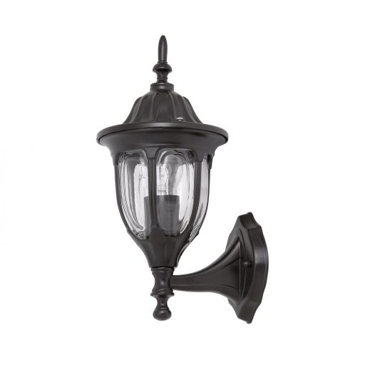 Klasszikus stílusú, kültéri fali lámpa, fekete színű fém vázzal, átlátszó üveg búrával, IP43-as védelemmel.