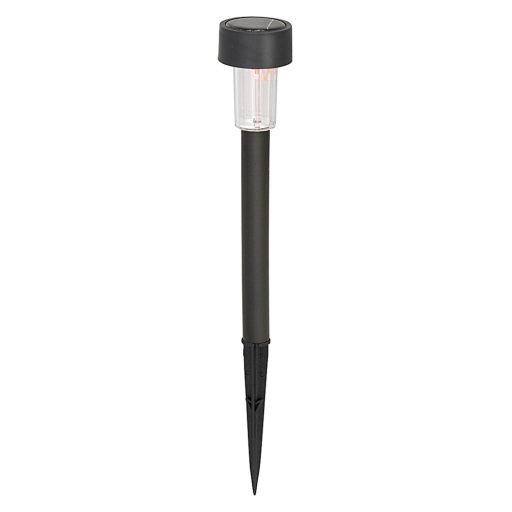 Kültéri földbe szúrható, napelemes lámpa, beépített LED fényforrással és akkumulátorral. 30 cm magas, fekete színű műanyag lámpatest és fehér színű műanyag lámpabúra, IP44-es, azaz fröccsenő víz és por elleni védelemmel. A lámpatest nappali fényben nem működik.