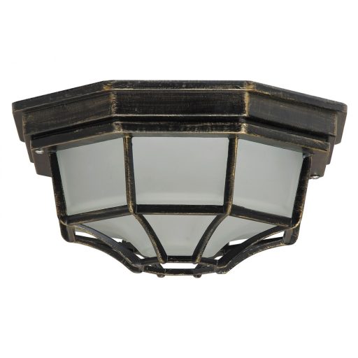 Klasszikus stílusú, kültéri mennyezeti lámpa, antik arany színű fém vázzal, átlátszó üveg búrával, IP44-es védelemmel.