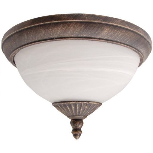 Klasszikus stílusú, kültéri mennyezeti lámpa, antik arany színű fém vázzal, fehér színű, alabástrom üveg búrával, IP43-as védelemmel.