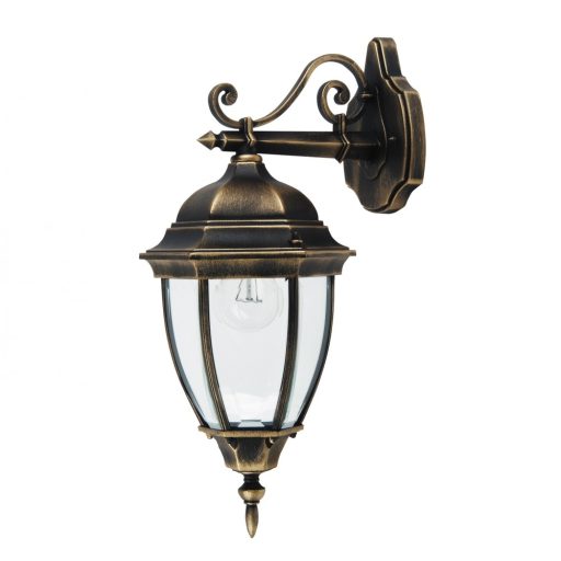 Klasszikus stílusú, kültéri fali lámpa, antik arany színű fém vázzal, átlátszó üveg búrával, IP44-es védelemmel.