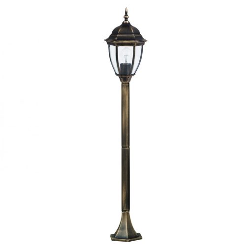 Klasszikus stílusú, kültéri álló lámpa, antik arany színű fém vázzal, átlátszó üveg búrával, IP44-es védelemmel.