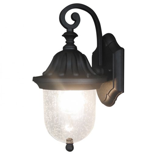 Klasszikus stílusú, kültéri fali lámpa, fekete színű fém vázzal, átlátszó üveg búrával, IP23-as védelemmel.