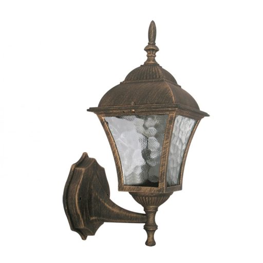 Klasszikus stílusú, kültéri fali lámpa, antik arany színű fém vázzal, üveg búrával, IP43-as védelemmel.