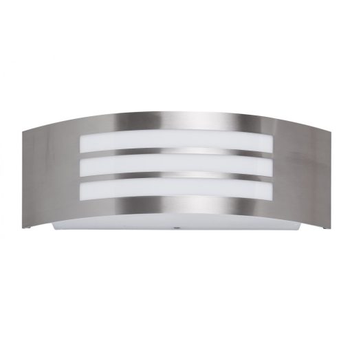 Modern stílusú, kültéri fali lámpa, rozsdamentes acél vázzal, opálos műanyag búrával, IP44-es védelemmel.