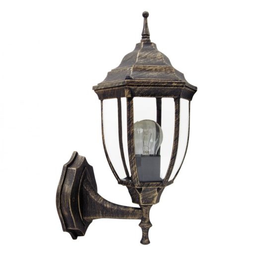 Klasszikus stílusú, kültéri fali lámpa, antik arany színű fém vázzal, átlátszó üveg búrával, IP43-as védelemmel.