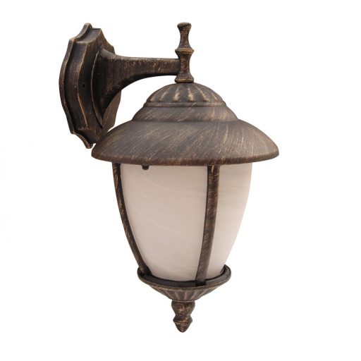 Klasszikus stílusú, kültéri fali lámpa, antik arany színű fém vázzal, fehér színű, alabástrom üveg búrával, IP43-as védelemmel.