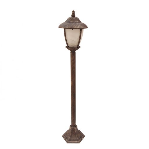 Klasszikus stílusú, kültéri álló lámpa, antik arany színű fém vázzal, fehér színű, alabástrom üveg búrával, IP43-as védelemmel.