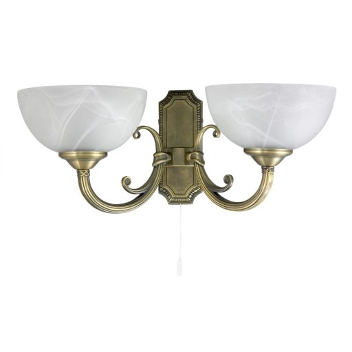 Klasszikus stílusú fali lámpa, bronz színű, díszített fém vázzal, fehér színű, alabástrom üveg búrával, húzókapcsolóval.