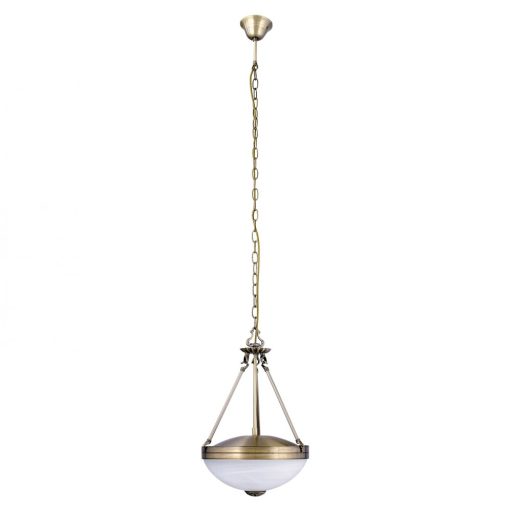 Klasszikus stílusú függeszték, bronz színű, díszített fém vázzal, fehér színű, alabástrom üveg búrával.