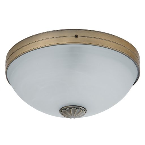 Klasszikus stílusú mennyezeti lámpa, bronz színű, díszített fém vázzal, fehér színű, alabástrom üveg búrával.