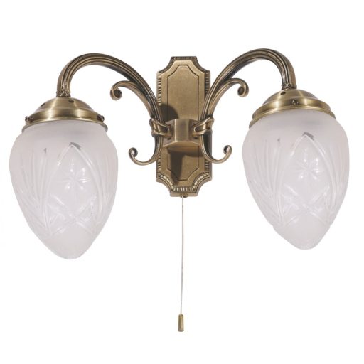 Klasszikus stílusú fali lámpa, bronz színű, díszített fém vázzal, szatinált fehér színű, metszett üveg búrával, húzókapcsolóval.