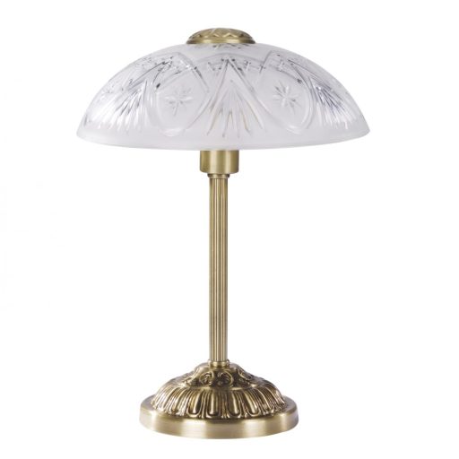 Klasszikus stílusú asztali lámpa, bronz színű, díszített fém vázzal, szatinált fehér színű, metszett üveg búrával, vezeztékre szerelt kapcsolóval.