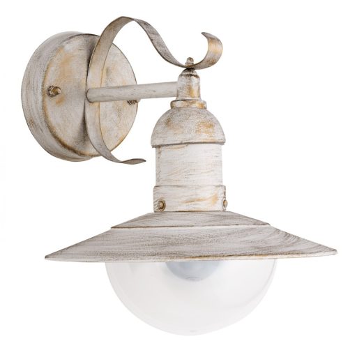 Klasszikus stílusú, kültéri falikar, antik fehér színű fém vázzal, átlátszó műanyag búrával, IP44-es védelemmel.