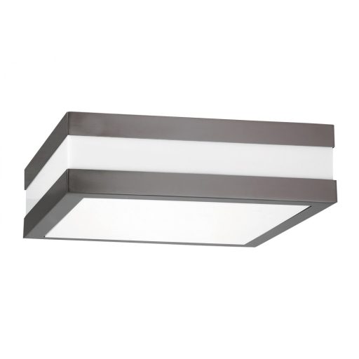 Modern stílusú, kültéri, szögletes mennyezeti lámpa, antracit színű fém vázzal, opálos műanyag búrával, IP44-es védelemmel.