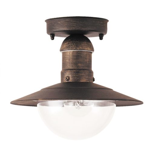 Klasszikus stílusú, kültéri mennyezeti lámpa, antik arany színű fém vázzal, átlátszó műanyag búrával, IP44-es védelemmel.