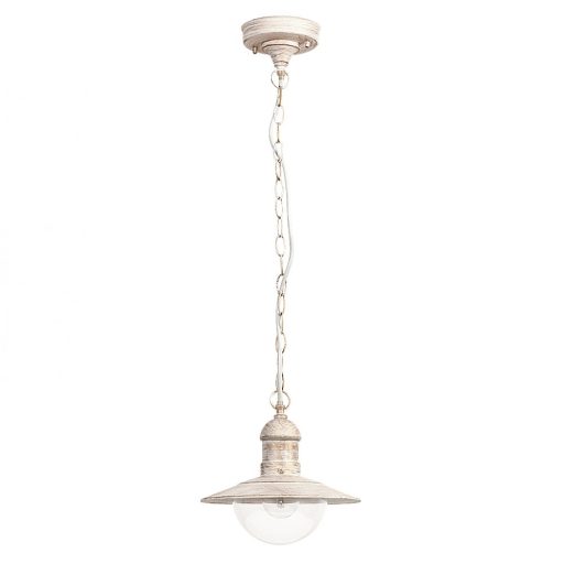 Klasszikus stílusú, kültéri függeszték, antik fehér színű fém vázzal, átlátszó műanyag búrával, IP44-es védelemmel.