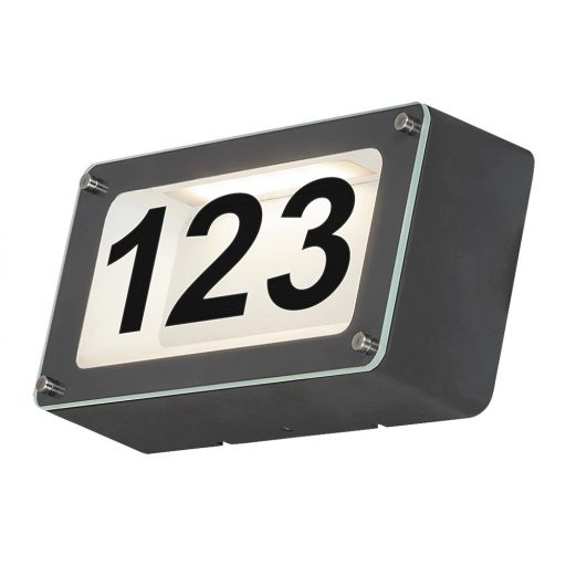 Modern stílusú, kültéri fali lámpa, antracit szürke színű fém vázzal, átlátszó műanyag búrával, IP54-es védelemmel, beépített LED fényforrással, házszám funkcióval.