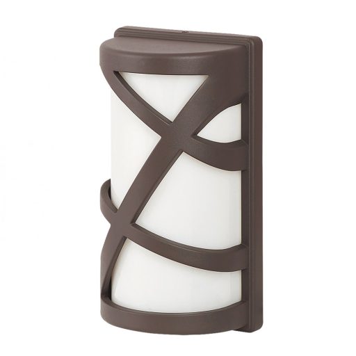 Modern stílusú, kültéri fali lámpa, barna színű fém vázzal, opálos műanyag betétes búrával, IP54-es védelemmel.