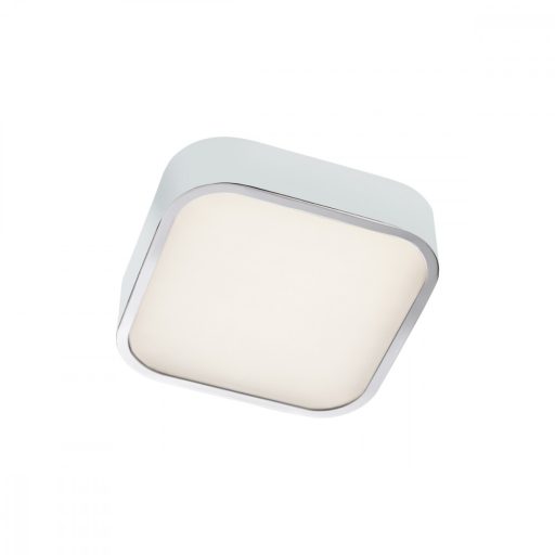 Króm színű fém vázas, fehér színű üveg búrás fürdőszobai mennyezeti lámpa beépített LED fényforrással, IP44-es védelemmel.