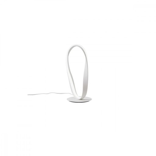 Légies megjelenésű, matt fehérre festett alumínium asztali lámpa fehér színű szilikon betétes búrával, beépített LED fényforrással, vezetékre szerelt kapcsolóval. A lámpa fényereje szabályozható.