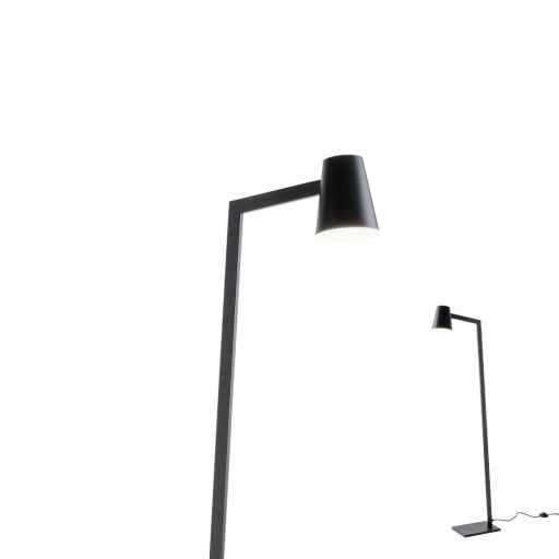 Matt fekete színű fém álló lámpa mozgatható fejjel, vezetékre szerelt kapcsolóval.