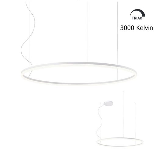 Design függeszték matt fehér színű fém, 28cm átmérőjű fém központi elemmel, 100cm átmérőjű fémgyűrű búrával és 68W meleg fehér fényű beépített LED fényforrással. Triac változat, egy külön vásárolható speciális kapcsoló segítségével fényerőszabályozható. A kapcsolóról érdeklődjön ügyfélszolgálatunkon.