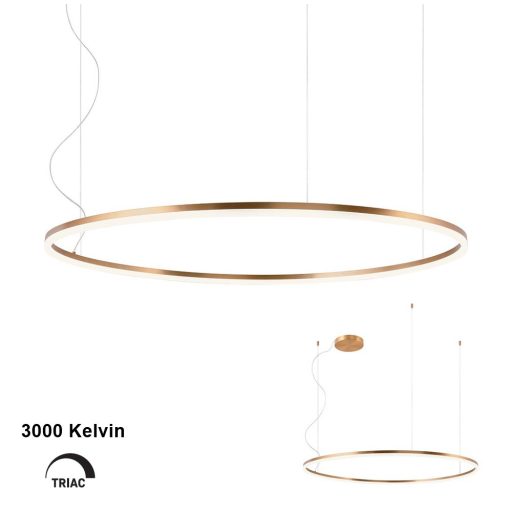 Design függeszték bronz színű fém, 28cm átmérőjű fém központi elemmel, 120cm átmérőjű fémgyűrű búrával és 76W meleg fehér fényű beépített LED fényforrással. Triac változat, egy külön vásárolható speciális kapcsoló segítségével fényerőszabályozható. A kapcsolóról érdeklődjön ügyfélszolgálatunkon.