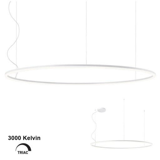 Design függeszték matt fehér színű fém vázzal, 28cm átmérőjű fém mennyezeti elemmel, 150cm átmérőjű akril betétes fémgyűrű búrával és 110W meleg fehér fényű beépített LED fényforrással.Triac változat, egy külön vásárolható speciális kapcsoló segítségével fényerőszabályozható. A kapcsolóról érdeklődjön ügyfélszolgálatunkon.