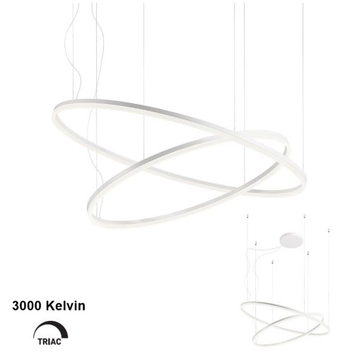 Design függeszték matt fehér színű fém központi elemmel gyűrű alakú búrákkal (átmérőjük 60 és 100cm) és függesztő elemekkel, 40,5 +68W beépített meleg fehér fényű LED fényforrással. A gyűrűk belógása illetve annak szöge a függesztő elemek segítségével állítható. Triac változat, egy külön vásárolható speciális kapcsoló segítségével fényerőszabályozható. A kapcsolóról érdeklődjön ügyfélszolgálatunkon.
