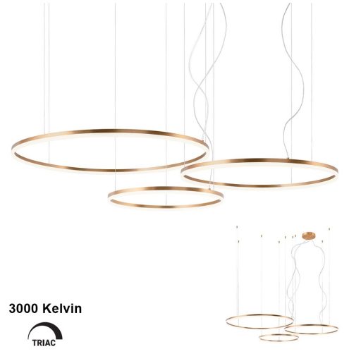 Design függeszték bronz színű fém központi elemmel gyűrű alakú búrákkal (átmérőjük 60, 80 és 100cm) és függesztő elemekkel, 40,5W+ 55W +68W beépített meleg fehér fényű LED fényforrással. A gyűrűk belógása illetve annak szöge a függesztő elemek segítségével állítható.Triac változat, egy külön vásárolható speciális kapcsoló segítségével fényerőszabályozható. A kapcsolóról érdeklődjön ügyfélszolgálatunkon.