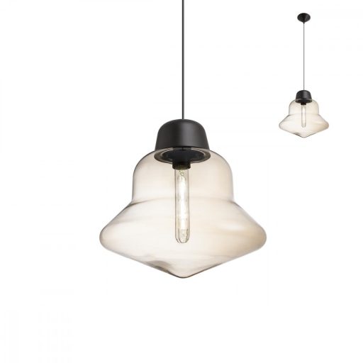 Matt fekete színű fém rögzítő elemes függeszték különleges formájú, pezsgő színű üveg búrával.