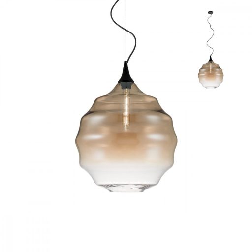 Matt fekete színű fém rögzítő elemes függeszték különleges formájú, pezsgő színű üveg búrával.