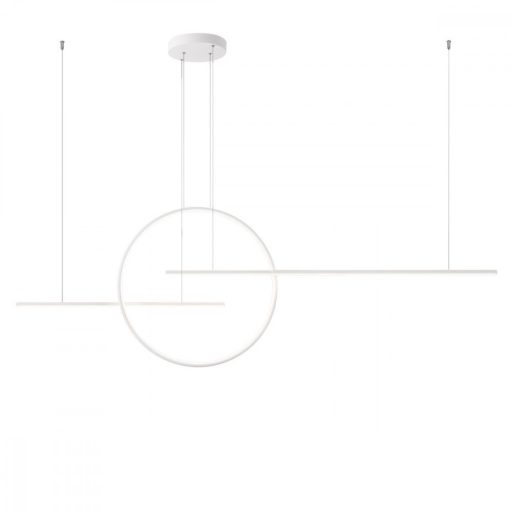 Nagy méretű függeszték matt fehérre festett fém és alumínium elemekkel, opálos szilikon betétes búrával, beépített LED fényforrással. A lámpa fényereje fali kapcsoló segítségével 3 lépcsőben szabályozható.