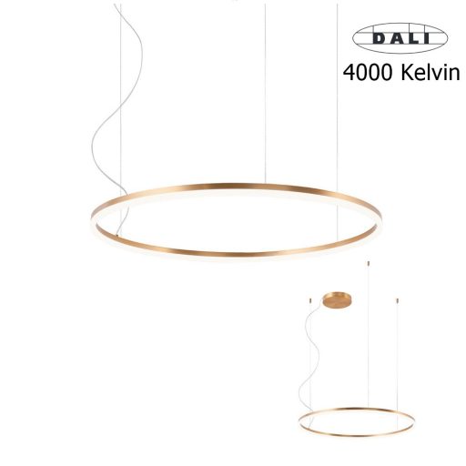 Design függeszték bronz színű fém, 25cm átmérőjű fém központi elemmel, 80cm átmérőjű fémgyűrű búrával és 55W hideg fehér fényű beépített LED fényforrással. A lámpa Dali világításvezérelt hálózatra kötve fényerőszabályozható. Dali rendszer különálló lámpák és világítási csoportok vezérlésére alkalmas rendszer. Ennek kiépítéséről kérje villanyszerelő szakember segítségét.
