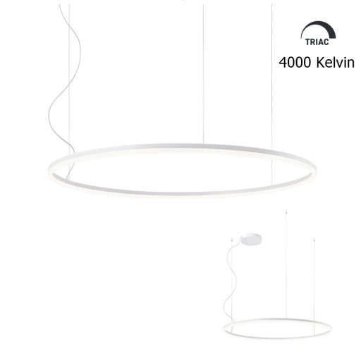 Design függeszték matt fehér színű fém, 28cm átmérőjű fém központi elemmel, 100cm átmérőjű fémgyűrű búrával és 68W hideg fehér fényű beépített LED fényforrással. Triac változat, egy külön vásárolható speciális kapcsoló segítségével fényerőszabályozható. A kapcsolóról érdeklődjön ügyfélszolgálatunkon.